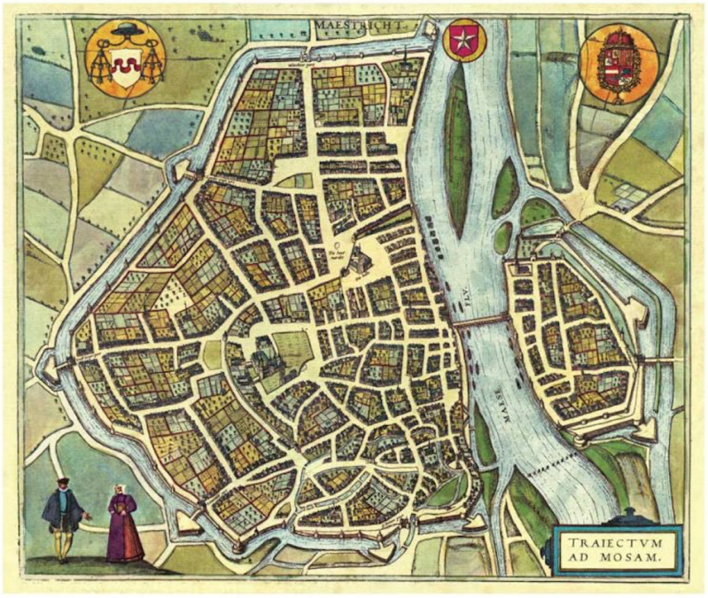 Gezicht op Maastricht, met op de voorgrond Wyck, in 1572 uitgegeven door Braun en Hogenberg.