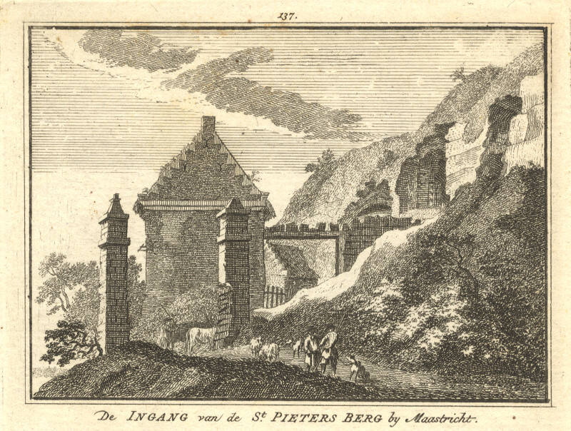 Een afbeelding van kerkgebouwtjes op de St. Pietersberg bij Maastricht, een kopergravure uit "Het Verheerlykt Nederland" uitgegeven door I. Tirion.